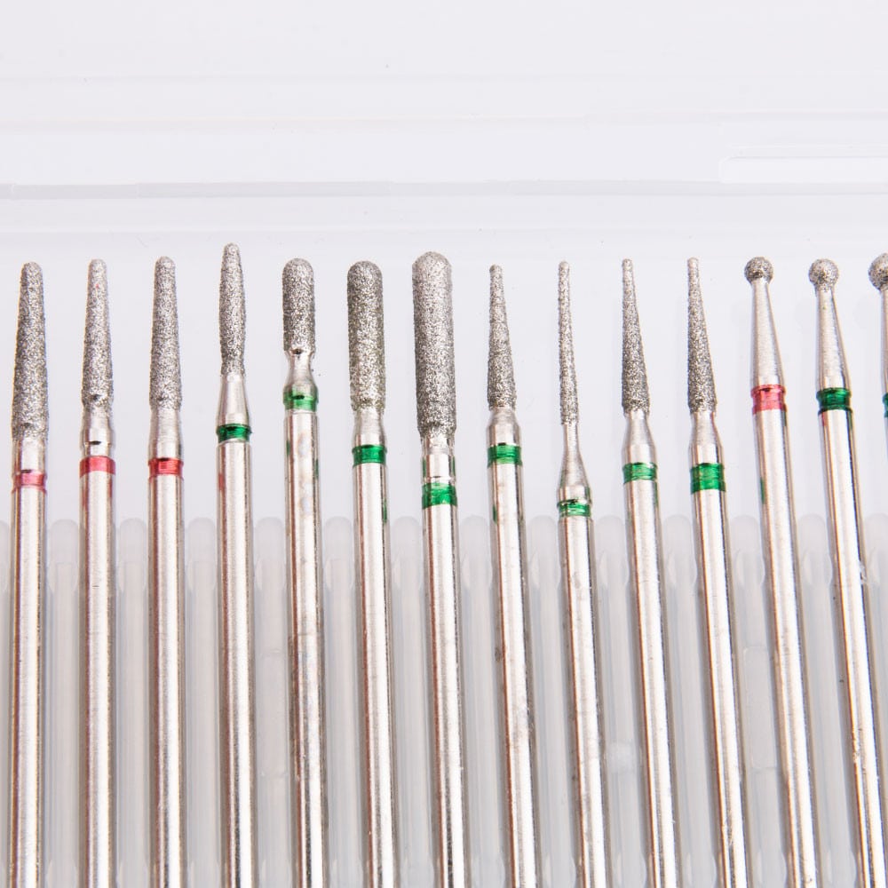 Diamantni brusni nastavki so izdelani iz izjemno trpežnega materiala, zato delo z njimi ne povzroča težav in je zelo učinkovito ter prijetno. Različne konice vam omogočajo, da oblikujete celotno nohtno površino. Uporabljajo se lahko za odstranjevanje hibridnega laka, gela ali akrila ali za piljenje obnohtne kožice.