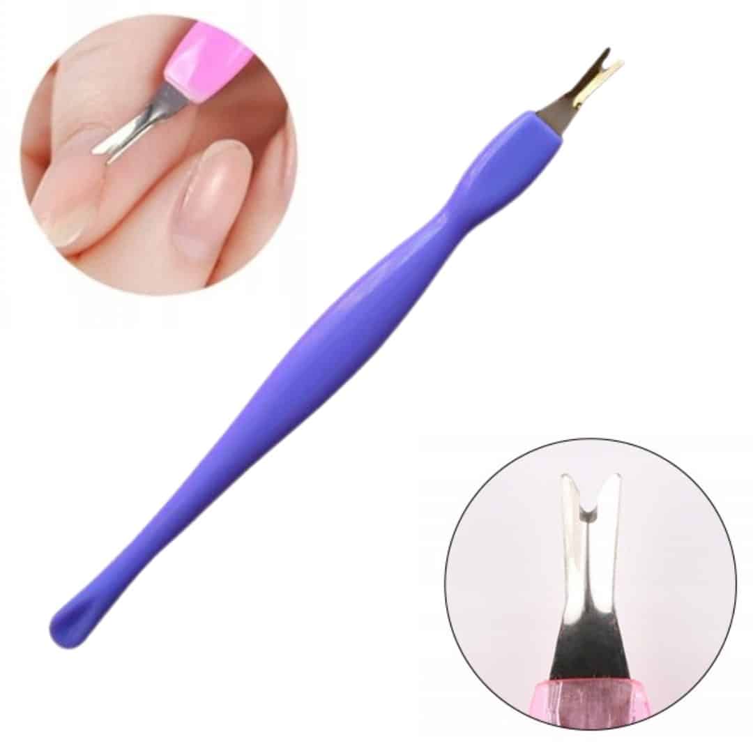 Dvostranski pripomoček za manikuro: odstranjevalec obnohtne kožice (stran z ostro kovinsko konico) in odstranjevalec ostankov laka/gela.