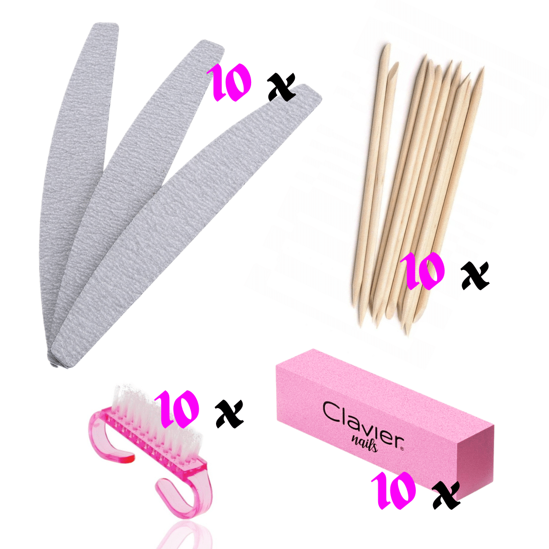 Priročen set vsebuje 3 pile lunca zebra različnih granulacij, 10 kos lesenih palčk, mini krtačko lila ter polirni blok lila. Nepogrešljiv set je osnovni pripomoček pri izvajanju manikure nohtov.