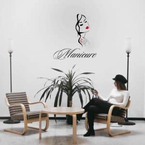 Samolepilna nalepka sodobnega dizajna za okrasitev sten, vrat ali ogledal vašega salona. Primerna je za lepljenje na popolnoma ravne površine. Nepogrešljiv pripomoček za prepoznavnost vaše poslovne dejavnosti.