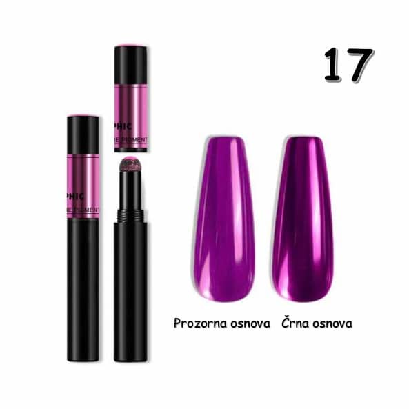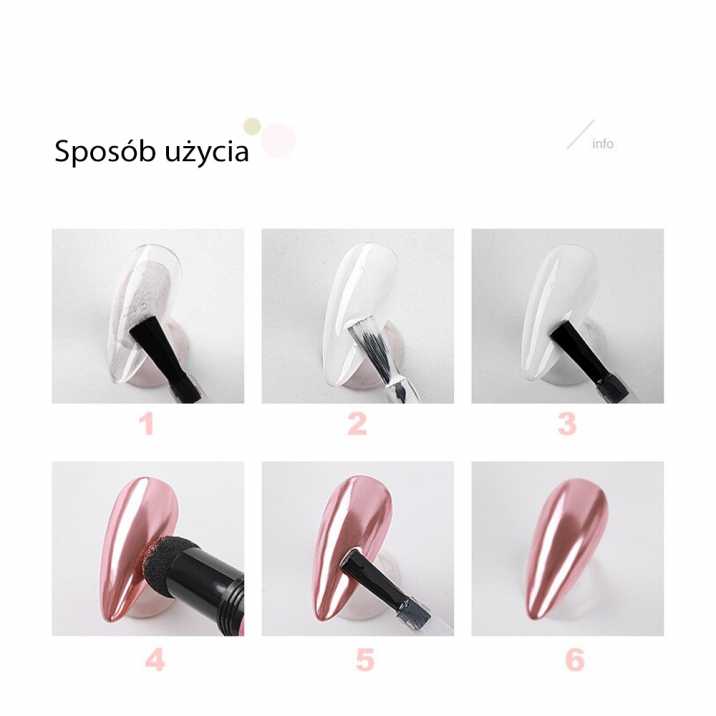 Edinstven prah za okrasitev nohtov v pisalu bo vašim nohtom zagotovil krom (kovinski izgled nohta. Prah se nanaša z natančnim nastavkom/aplikatorjem v obliki mehke gobice, ki omogoča minimalno porabo prahu.