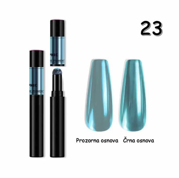 Edinstven prah za okrasitev nohtov v pisalu bo vašim nohtom zagotovil krom (kovinski izgled nohta. Prah se nanaša z natančnim nastavkom/aplikatorjem v obliki mehke gobice, ki omogoča minimalno porabo prahu.