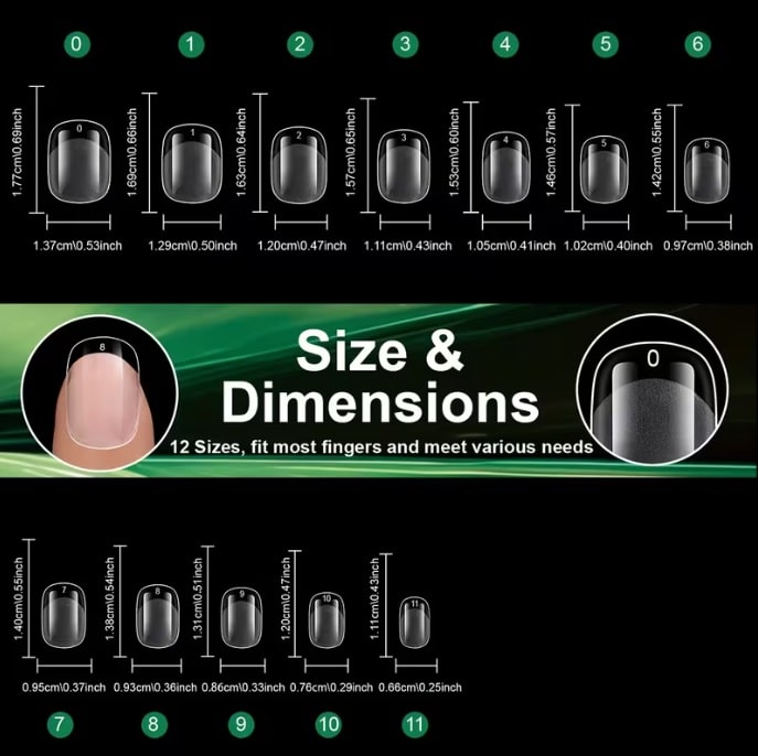 12 velikosti vam omogoča, da izberete konice za različne širine naravnih nohtnih plošč. Konice je mogoče enostavno oblikovati glede na vaše potrebe po oblikovanju nohtov.