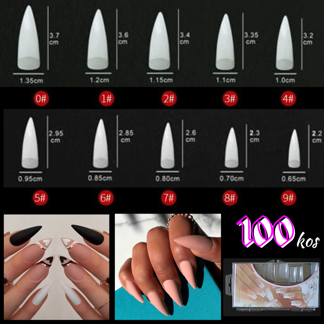 Stiletto – oblika, primerna za ženske s tankimi kratkimi prsti in majhno ploščo za nohte. Takšna manikura v vsakdanjem življenju zahteva skrbno pozornost. Koničasti nohti vizualno podaljšajo prste in jih naredijo bolj elegantne. Za veliko roko je ta oblika popolnoma neprimerna.